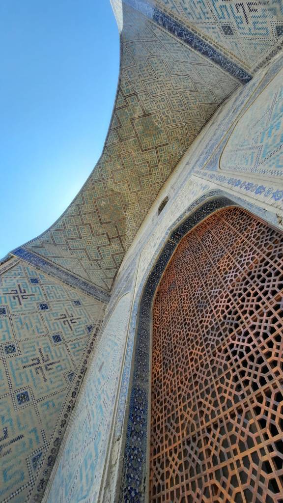 La journée se poursuit vers la mosquée Bibi-Khanym qui fut construite entre 1399 et 1404, un peu trop vite pour un bâtiment de cette envergure, elle se détériore rapidement et les différents tremblements de terre n’aidèrent pas l’édifice gigantesque : 167m de long, 109m de large, deux minarets de 50m et un iwan de 35m de haut.