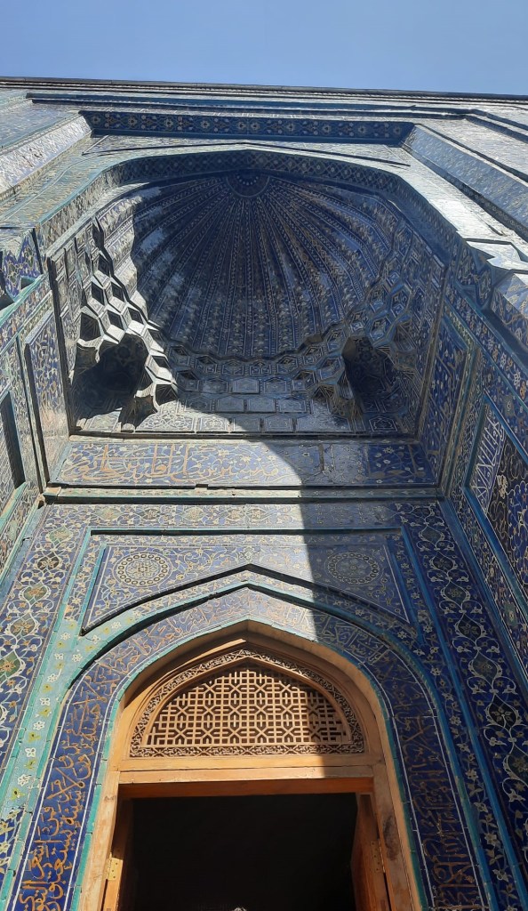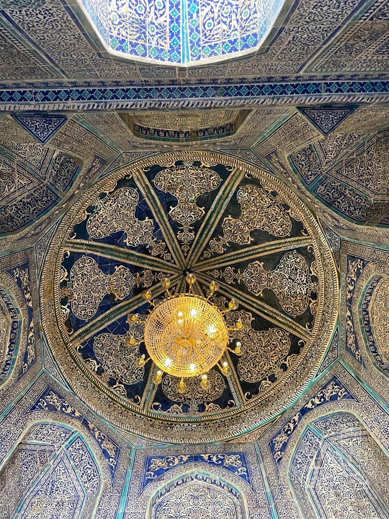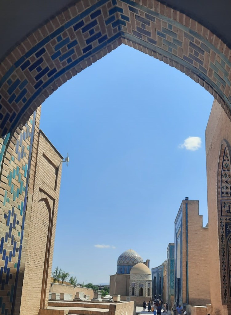 Nous marchons un peu pour atteindre le complexe de Chah-e-Zindeh fondé au XIe siècle, au début de la dynastie des Qarakhanides. C’est un endroit hautement sacré pour les musulmans, en raison de la présence de la tombe de Qutham Ibn Abbas (cousin du prophète Mohamed). C’est aussi un trésor architectural qui attire de nombreux voyageurs.