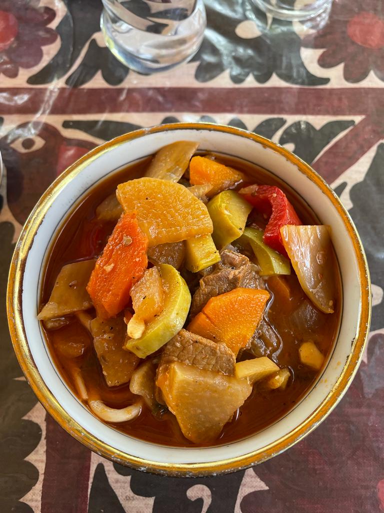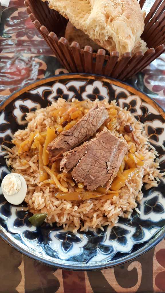 La Terrassa près de l’Ark est une superbe adresse pour la vue, le service et évidemment la cuisine, ce fut notre restaurant coup de cœur. Goûtez absolument Shivit Oshi des nouilles à l’aneth qui sont une spécialité de Khiva. D’ailleurs si vous aimez l’aneth vous serez ravis, les ouzbeks en mettent partout.