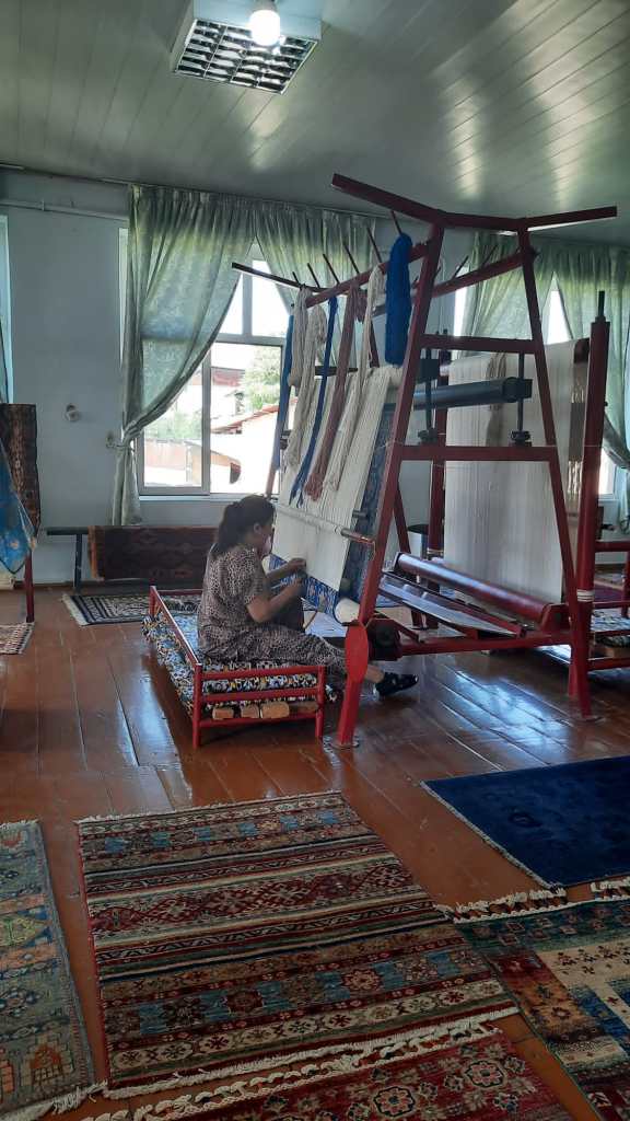 Nous étions curieuses de voir des tapis en soie, après quelques échanges avec Zukhro nous décidons de faire un arrêt dans un atelier. Nous n’avons rien acheté et on ne vous poussera pas à l’achat, les commandes sont assez nombreuses d’après ce que nous avons compris. Ce fut l’occasion de voir de très belles pièces, apprendre la différence entre un tapis fait main et à la machine et aussi se mettre au frais un instant en cette chaude journée (35°C).